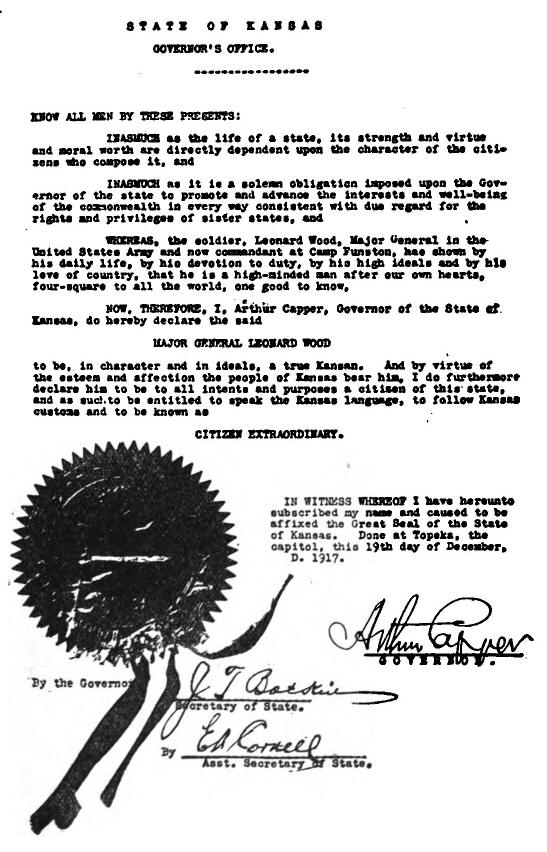 A few days later Wood had returned to Funston and begun preparations for the training of the 10th Division, when by executive action the Governor of Kansas acknowledged on his own behalf and on behalf of the State the General's services to his country by making him a "citizen extraordinary" of the State.