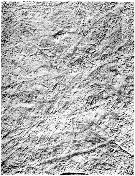 It took me some years to find any similar markings again. In the early spring of 1903 I had occasion to make a visit to Mexico, when I spent a half day in Ojinaga, which is a little village south of Presidio, in Texas, on the Mexican side of the river. Some sidewalks in this little village are built of flags of limestone belonging to the Eagle Ford formation. To my great delight I found some of these slabs having precisely the same kind of markings that I had noted on the sandstone in Dakota. Naturally I attached some importance to the fact that the Eagle Ford corresponds quite closely in age to that of the Dakota sandstone. Both were made at about the beginning of the upper Cretaceous age. I noticed here a considerable variation in the closeness of the patterns of the markings. Occasionally they were found as separate single lines, several inches removed from each [p.5]other; and on other rocks they would be found crossing in close networks. In the summer of 1904 I again found my ice markings on a layer of arenaceous limestone in the same formation in the Big Bend country in Texas. This time I collected some specimens which were subsequently photographed. One of these photographs is shown in Plate II. Again in 1906 I noticed the same markings on some thin sandy flags which occur in the Del Rio clay near the city of Del Rio. In this case the needle-like crystals were somewhat more slender than those previously seen, and some were slightly curved and somewhat more elongated. These of course interested me as showing the occurrence of freezing temperatures no doubt at a somewhat earlier time than that pertaining to my previous observations.