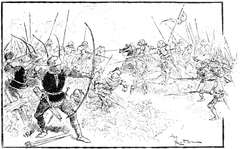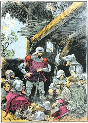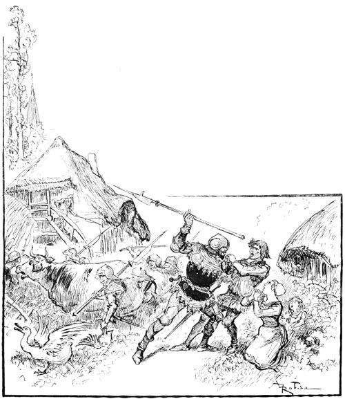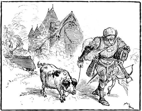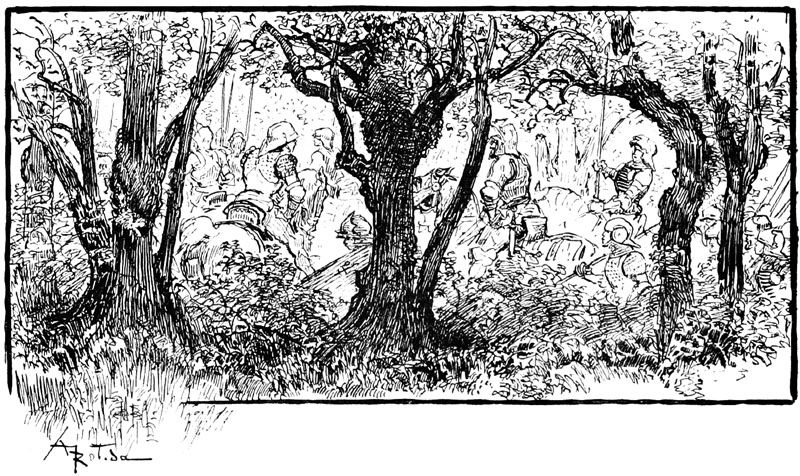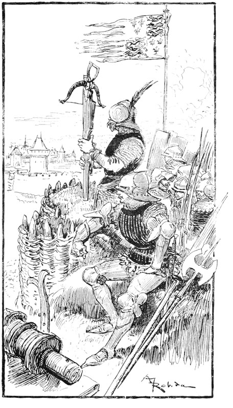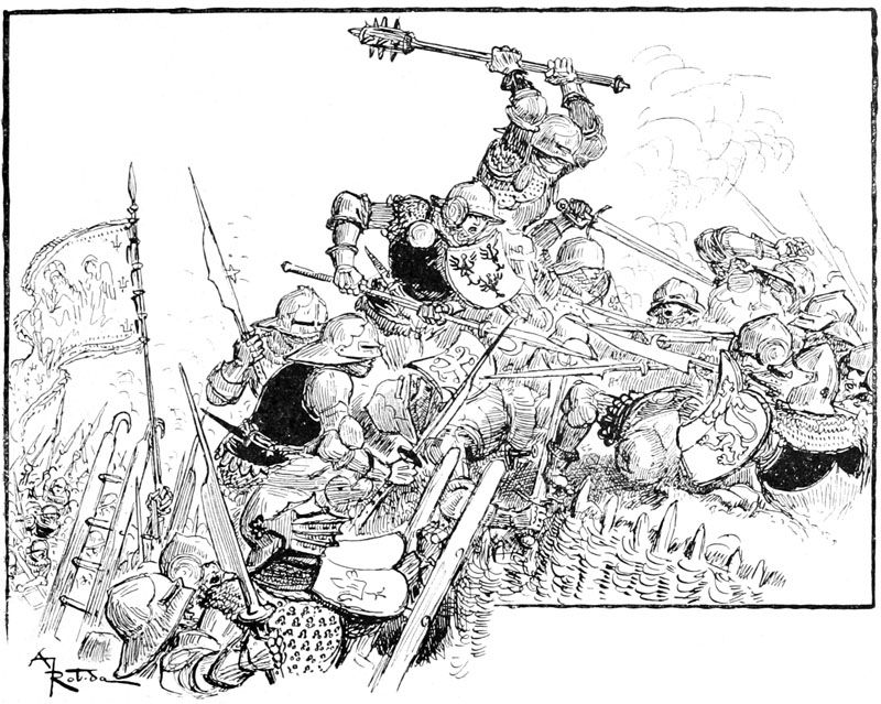 Jehan des Torgnoles fut de ceux qui bataillèrent avec le plus de cœur et aussi les meilleurs bras, tant sur les remparts attaqués, que dans la sortie dernière, à la délivrance de la ville, superbe occasion pour lui de se laisser aller franchement à son appétit pour les bagarres et les coups. Il en eut tout son compte, c'est-à-dire ce qui eût amplement suffi pour quatre, mais finalement, par bonheur pour la pauvre Guillemette restée sans famille, il se tira de toutes les mêlées sans horions par trop graves.