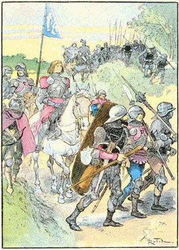 C'était en effet Flavy qui s'engageait sur le pont avec une troupe de cavaliers. A côté de lui marchaient Jehanne, en armure complète recouverte d'un surcot cramoisi déchiqueté en longues bandes, Xaintrailles et La Hire, Pierre d'Arc et une demi-douzaine de chevaliers.