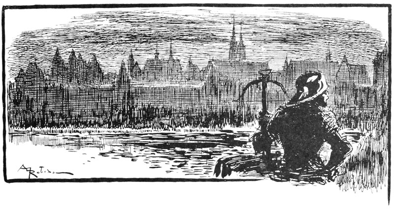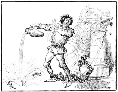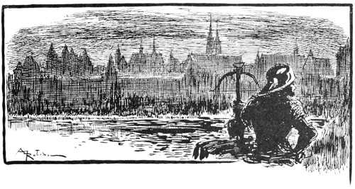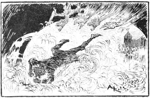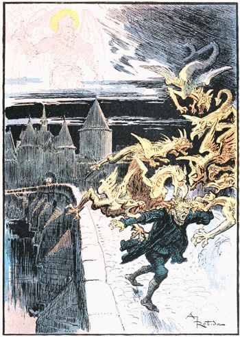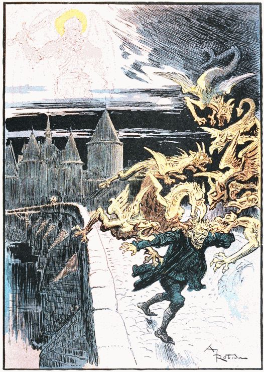 Poursuivi, happé par les becs, déchiré par les griffes de pierre, Rongemaille hurlant et gesticulant, semant son or sur les pavés, sauta d'un bond sur le parapet entre deux moulins et se précipita dans la rivière. L'eau sous le choc sembla bouillonner et se referma. La lune se voila d'un nuage, dragons et guivres de pierre disparurent subitement et la figure de l'archange s'effaça.