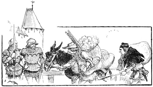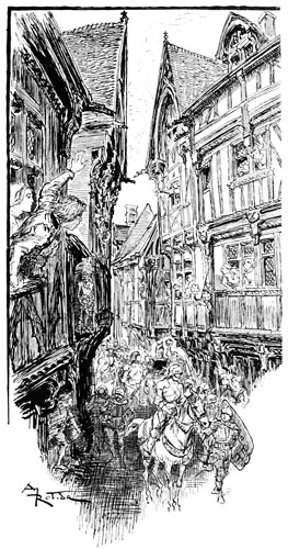 —Eh bien, qu'est-ce? une sédition?... ouvrez vos rangs, bonnes gens, que nous y mettions bon ordre! criait le sire de Flavy en poussant son cheval sans regarder s'il bousculait un peu les paniers de légumes et cages à poulets.