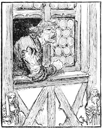 Un tas de trognons de choux et de débris de légumes fournit aux amis de Jehan un supplément de projectiles auxquels répondirent quelques potées d'eau lancées par Rongemaille. Sur ce, quelques cailloux se mêlèrent aux trognons de choux, certaines vitres souffrirent, puis la fenêtre se ferma brusquement, après une bordée d'injures qu'on n'entendit pas, mais l'usurier jaillit de sa porte.
