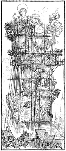 Cependant les amis de Jehan des Torgnoles, ayant quitté les brocs, après les avoir consciencieusement vidés, stationnaient maintenant sur le parvis de Saint-Corneille, juste sous les échafaudages. Le nez en l'air, ils se poussaient du coude et riaient aux éclats depuis quelques minutes. Il suffit qu'une personne dans la rue lève le nez, même quand il ne se passe absolument rien dans les régions supérieures, pour que tous les passants s'arrêtent intrigués et braquent leurs regards vers les nuages qui filent.