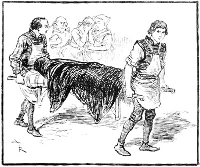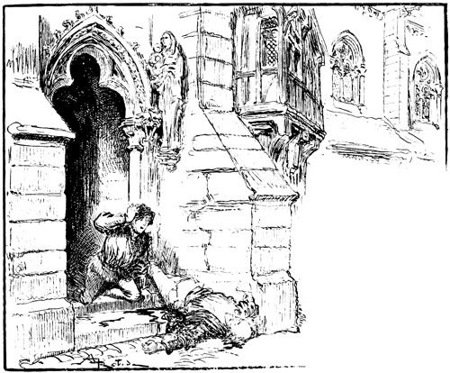 Pendant que Jehan et quelques hommes fouillaient de fond en comble le logis de Rongemaille sans parvenir à mettre la main sur le misérable, le corps du pauvre Bonvarlet était porté dans sa maison sous la tour Beauregard, suivi seulement de quelques amis de l'ymagier, qui s'efforçaient de soutenir Guillemette à moitié évanouie, et la grosse Martinotte suffoquant sous les sanglots.