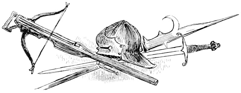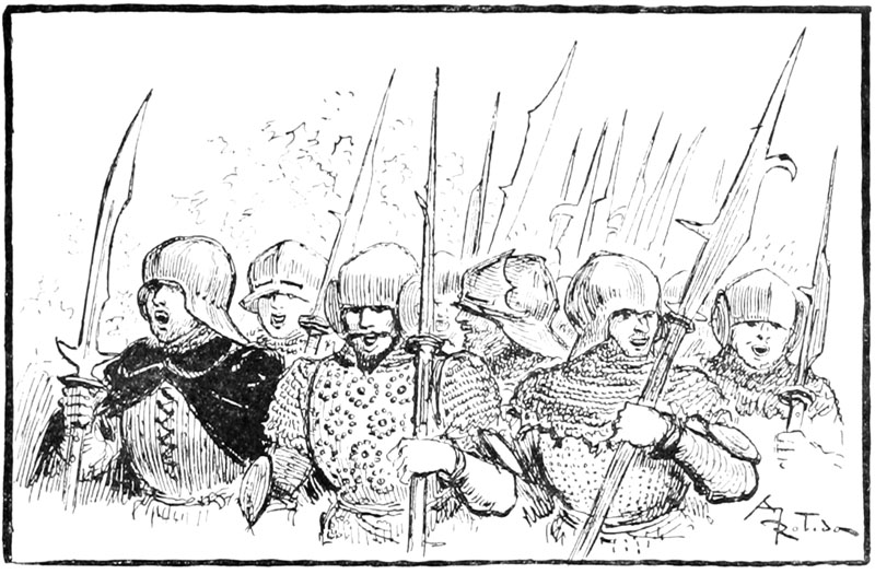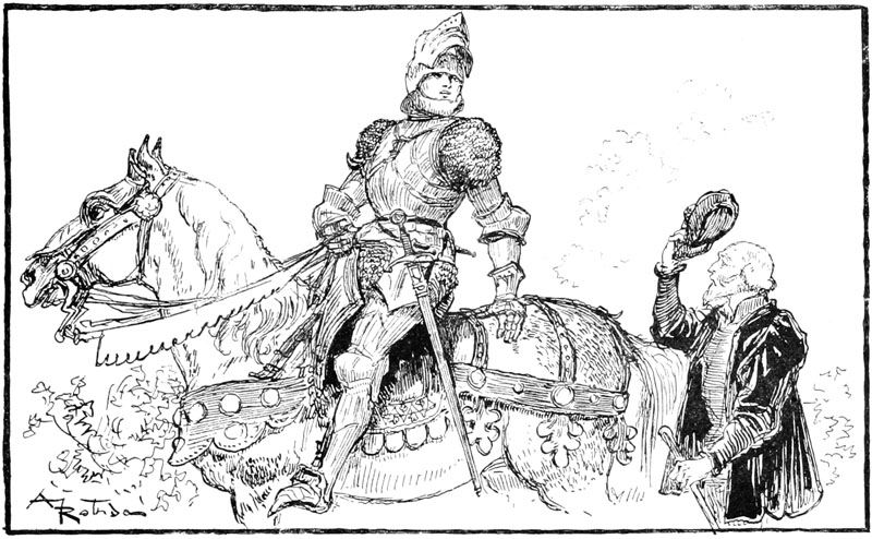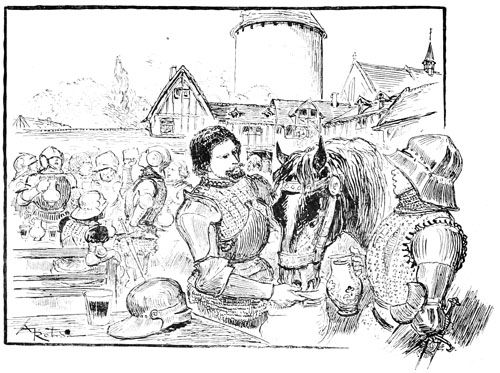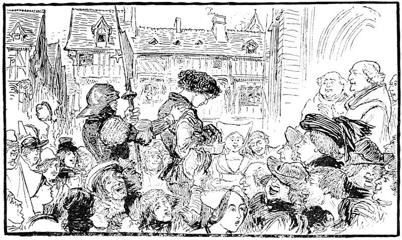 Au même instant la porte des bâtiments de l'Abbaye sur la droite du parvis s'ouvrait toute grande et laissait voir messire l'abbé lui-même, accompagné de quelques moines, pendant que de l'autre côté de la place une quinzaine de soldats accouraient du poste du pont, où le tumulte de la place du Marché avait donné l'alarme. Un gentilhomme à cheval, en demi-armure, les conduisait, et ce n'était rien moins que le gouverneur lui-même, Guillaume de Flavy, chevalier de haute taille et de forte corpulence, à poing rude et mine sévère, bien propre à refréner vite toute idée de désordre parmi les plus turbulents.