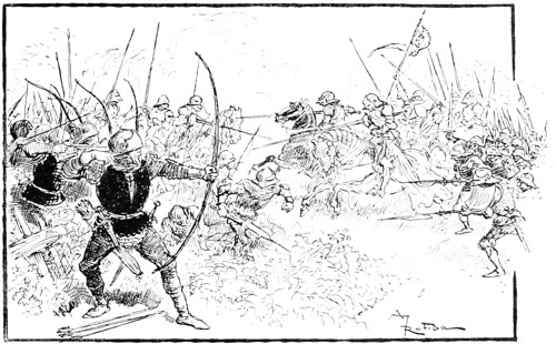 Mais des renforts nombreux arrivent des cantonnements anglais; de tous les côtés des bandes de soudards furieux tombent sur les gens de la sortie, à leur tour obligés de reculer. Les flèches et les carreaux d'arbalète pleuvent sur eux. Ils sont ramenés et poussés en désordre par la masse des assiégeants jusqu'au bastillon du pont, au bruit lugubre du tocsin sonnant à toutes les églises de Compiègne.