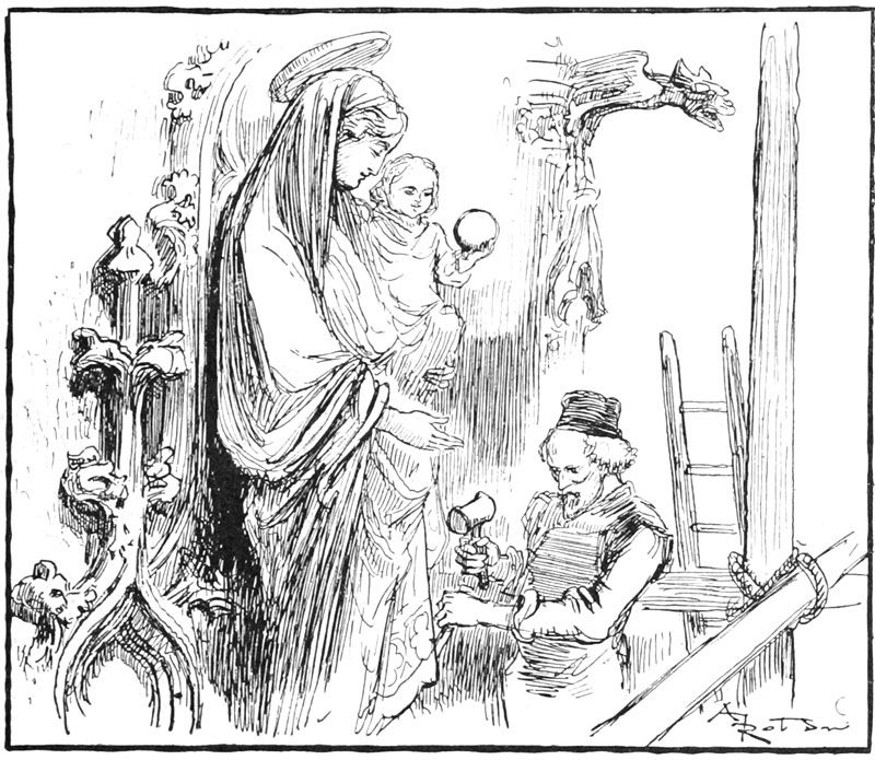 Jehan, penché sur sa planche, s'adressait à un autre sculpteur qui, sur un échafaudage placé au-dessous de lui, était très occupé à polir et affiner les longs plis tombants du manteau de la Vierge, dans un groupe de figures occupant le tympan du grand portail.