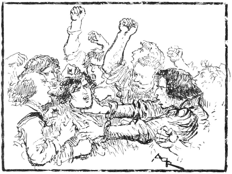 —Le brigand! le traître! Il ne faut pas le manquer, lui!...—Il a bien une tête d'assassin! Où avions-nous les yeux tout à l'heure?—Pauvre Jehan, qu'allions-nous faire?—Oh, moi, j'ai toujours prédit que le Rongemaille finirait mal!... Hardi! Enfonçons la porte! Portons-le à messire de Flavy!...