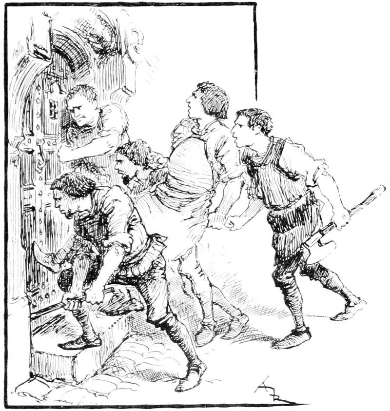 Cependant la foule, avec Jehan en tête, se jetait sur la porte de Rongemaille pour l'enfoncer. Elle eût résisté longtemps si des compagnons forgerons ne s'en fussent mêlés avec des haches et des leviers. Aussitôt enfoncée, les assaillants se précipitèrent. Le logis n'était pas grand, on eut bien vite parcouru les chambres du rez-de-chaussée et de l'étage. Personne. Rongemaille avait disparu. Dans une chambre on aperçut quelques pièces d'or par terre sur un parquet fraîchement lavé. On grimpa au grenier, le grenier était vide. Comment Rongemaille pouvait-il avoir disparu? Dans quelle cachette s'était-il jeté? On sondait les murs, on regardait dans le puits, on explorait la cave, profonde comme elles sont dans toutes les vieilles cités et qui pouvait communiquer avec les caves voisines ou même les souterrains de l'abbaye. Rien. Personne! Le misérable Rongemaille semblait s'être littéralement évaporé.