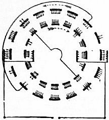 The Eisteddfod in its present character appears to have originated in the time of Owain ap Maxen Wledig, who at the close of the 4th century was elected to the chief sovereignty of the Britons on the departure of the Romans. It was at this time, or soon afterwards, that the laws and usages of the Gorsedd were codified and remodelled, and its motto of “Y gwir yn erbyn y byd” (The truth against the world) given to it. “Chairs” (with which the Eisteddfod as a national institution is now inseparably connected) were also established, or rather perhaps resuscitated, about the same time. The chair was a kind of convention where disciples were trained, and bardic matters discussed preparatory to the great Gorsedd, each chair having a distinctive motto. There are now existing four chairs in Wales,—namely, the “royal” chair of Powys, whose motto is “A laddo a leddir” (He that slayeth shall be slain); that of Gwent and Glamorgan, whose motto is “Duw a phob daioni” (God and all goodness); that of Dyfed, whose motto is “Calon wrth galon” (Heart with heart); and that of Gwynedd, or North Wales, whose motto is “Iesu,” or “O Iesu! na’d gamwaith” (Jesus, or Oh Jesus! suffer not iniquity).