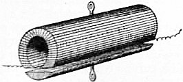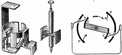 Forms of Electromagnet.—The form which an electromagnet must take will greatly depend upon the purposes for which it is to be used. A design or form of electromagnet which will be very suitable for some purposes will be useless for others. Supposing it is desired to make an electromagnet which shall be capable of undergoing very rapid changes of strength, it must have such a form that the coercivity of the material is overcome by a self-demagnetizing force. This can be achieved by making the magnet in the form of a short and stout bar rather than a long thin one. It has already been explained that the ends or poles of a polar magnet exert a demagnetizing power upon the mass of the metal in the interior of the bar. If then the electromagnet has the form of a long thin bar, the length of which is several hundred times its diameter, the poles are very far removed from the centre of the bar, and the demagnetizing action will be very feeble; such a long thin electromagnet, although made of very soft iron, retains a considerable amount of magnetism after the magnetizing force is withdrawn. On the other hand, a very thick bar very quickly demagnetizes itself, because no part of the metal is far removed from the action of the free poles. Hence when, as in many telegraphic instruments, a piece of soft iron, called an armature, has to be attracted to the poles of a horseshoe-shaped electromagnet, this armature should be prevented from quite touching the polar surfaces of the magnet. If a soft iron mass does quite touch the poles, then it completes the magnetic circuit and abolishes the free poles, and the magnet is to a very large extent deprived of its self-demagnetizing power. This is the explanation of the well-known fact that after exciting the electromagnet and then stopping the current, it still requires a good pull to detach the “keeper”; but when once the keeper has been detached, the magnetism is found to have nearly disappeared. An excellent form of electromagnet for the production of very powerful fields has been designed by H. du Bois (fig. 6).