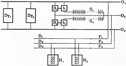 The importance of this investigation resides in the fact that an electrometer of the above pattern can be used as a wattmeter (q.v.), provided that the deflection of the needle is proportional to the potential difference of the quadrants. This use of the instrument was proposed simultaneously in 1881 by Professors Ayrton and G.F. Fitzgerald and M.A. Potier. Suppose we have an inductive and a non-inductive circuit in series, which is traversed by a periodic current, and that we desire to know the power being absorbed to the inductive circuit. Let v1, v2, v3 be the instantaneous potentials of the two ends and middle of the circuit; let a quadrant electrometer be connected first with the quadrants to the two ends of the inductive circuit and the needle to the far end of the non-inductive circuit, and then secondly with the needle connected to one of the quadrants (see fig. 5). Assuming the electrometer to obey the above-mentioned theoretical law, the first reading is proportional to