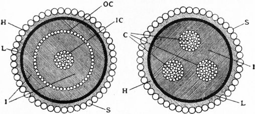 In their researches on radioactivity M. and Mme P. Curie employed an electroscope made as follows:—A metal case (fig. 5), having two holes in its sides, has a vertical brass strip B attached to the inside of the lid by a block of sulphur SS or any other good insulator. Joined to the strip is a transverse wire terminating at one end in a knob C, and at the other end in a condenser plate P′. The strip B carries also a strip of gold-leaf L, and the metal case is connected to earth. If a charge is given to the electroscope, and if any radioactive material is placed on a condenser plate P attached to the outer case, then this substance bestows conductivity on the air between the plates P and P′, and the charge of the electroscope begins to leak away. The collapse of the gold-leaf is observed through an aperture in the case by a microscope, and the time taken by the gold-leaf to fall over a certain distance is proportional to the ionizing current, that is, to the intensity of the radioactivity of the substance.