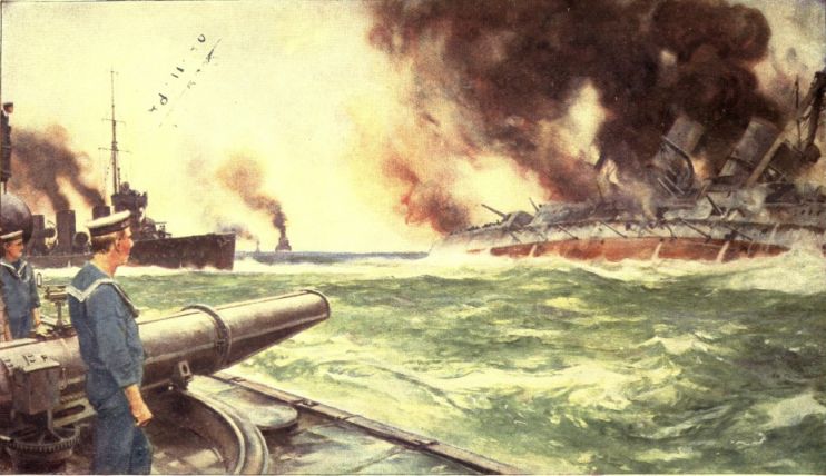 And now while the chase continues, we must return to the Bluecher, which had made a gallant fight, but was nearing her end. Ship after ship had turned its guns upon her with terrible effect: her upper works had been smashed to atoms, and practically every gun which she possessed had been put out of action. Shot and shell had rained upon her, and she was burning furiously.