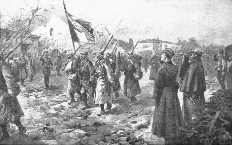 In those November days heartrending scenes were witnessed on the Serbian hills, now white with the first snows of winter. Fugitives in ox wagons, in country carts, and on foot, men, women, and little children, thronged the roads—a long procession of woe. The army which, a year ago, had flung the Austrians out of the country, was now a mere remnant of 150,000 famished and weary men. With it marched our British Naval Brigade and its guns. The devoted doctors and nurses, who had for nine months been ministering to the wounded and diseased, were scattered far and wide. By roundabout roads some of them reached the Allies at Salonika; others gained the Adriatic coast; and some, such as Lady Paget, remained and trusted to the tender mercies of the Bulgarians. Retreating with the army were the officials of the Court and the Government. Perhaps the most pathetic figure of all was the Serbian King, racked by rheumatism and sore of heart because his age and infirmities prevented him from fighting in the ranks with his heroic peo[400]ple. But behind all his sorrows there was a ray of hope. His army, though but a remnant, was still an army, and not a broken and dispirited mob. It would live to fight again.