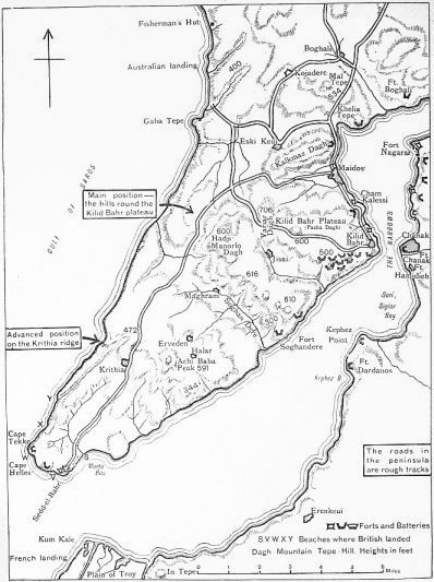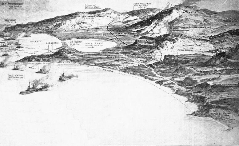 [44] In the Turkish island of Lemnos, one of the largest islands in the Ægean Sea. It is about sixty miles as the aeroplane flies from Gaba Tepe.