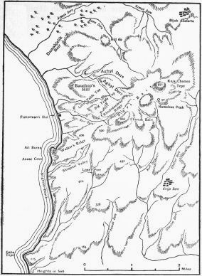[10] Unnamed hills are numbered on the map by their height above sea-level. Thus Hill 132 means a hill which is 132 metres, or 440 ft., in elevation.