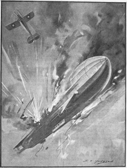 "Traffic is at a standstill. A million quiet cries make a subdued roar. Seven million people of the biggest city in the world stand gazing into the sky from the darkened streets. . . . Among the autumn stars floats a long, gaunt Zeppelin. It is dull yellow—the colour of the harvest moon. The long fingers of searchlights, reaching up from the roofs of the city, are touching all sides of the death messenger with their white tips. Great booming sounds shake the city. They are Zeppelin bombs—falling, killing, burning. Lesser noises—of shooting—are nearer at hand, the noise of aerial guns sending shrapnel into the sky. . . . If the men up there think they are terrifying London, they are wrong. They are only making England white-hot mad."