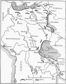 What was the plan of campaign? Von Gallwitz, with the great artillery engine which had driven the Russians back from Galicia into the marshes of the Pripet, was to cross the Danube between Orsova on the Rumanian border and Belgrade, and blast his way through the triangle of country between the railway and the Bulgarian frontier. At the same time the Austrians were to strike south to the west of Belgrade, and while these two movements were in progress Bulgaria was to fall upon Serbia from the east. The little Serbian army was to be taken in front and in flank at nine different points by forces which outnumbered it by at least three to one. The invaders were furnished with huge guns and vast supplies of ammunition, against which the Serbians could not hope to stand. The moment that the blow was launched the fate of Serbia was sealed.