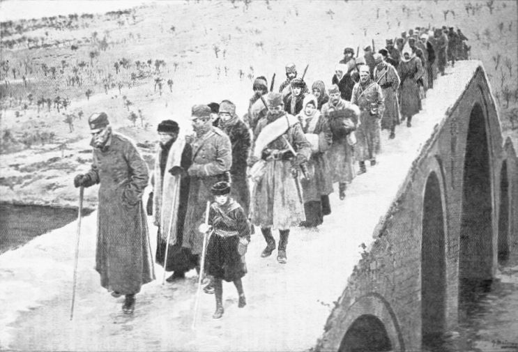 The Serbians were now in a desperate plight. Along every road and track left open to the south-west thousands of old men, women, and children trudged wearily onward, bearing with them the few household goods which they could carry off. Food was scarce, carts could not be obtained for love or money, and on the desolate hills thousands of wretched peasants perished of cold and hunger. By 26th October the whole north-east corner of Serbia was in the hands of the enemy. The Serbian army which lay between the Drina and Nish was cut off from that which lay in the shape of a half-moon in front of the southern Bulgarian army. There was no more fighting for the northern army; it was slowly but surely being enclosed, and was now in full retreat along the valley of the river Ibar on the road to Montenegro. Meanwhile the southern army made a last despairing effort to stem the Bulgarian advance in the passes between Prisrend and Monastir, and, having failed, retreated into Albania.