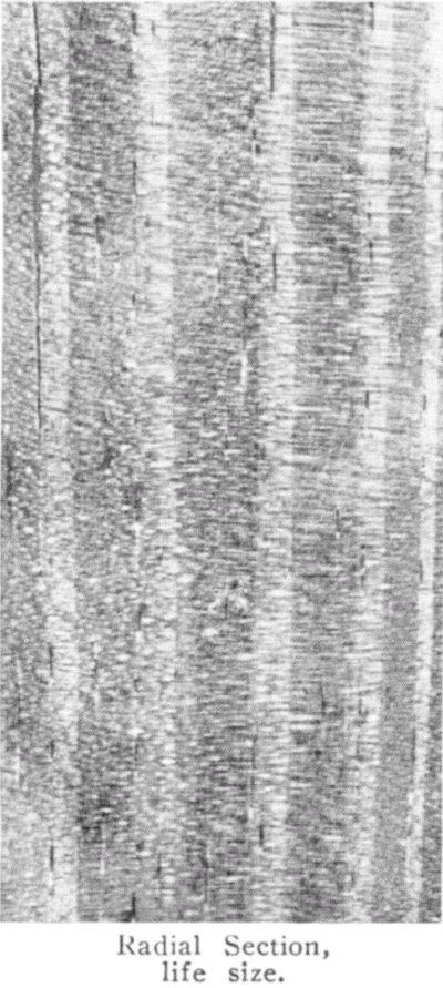 | 2. Pith rays barely distinct, pores more numerous and commonly forming a more porous spring wood zone; wood of medium weight. | Canoe or Paper Birch. |