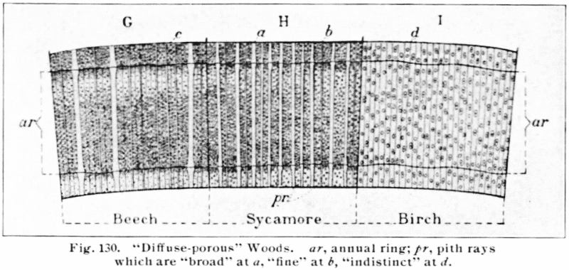 | 1. Pith rays fairly distinct, the pores rather few and not more abundant in the spring wood: wood heavy, usually darker. | Cherry Birch and Yellow Birch. |
