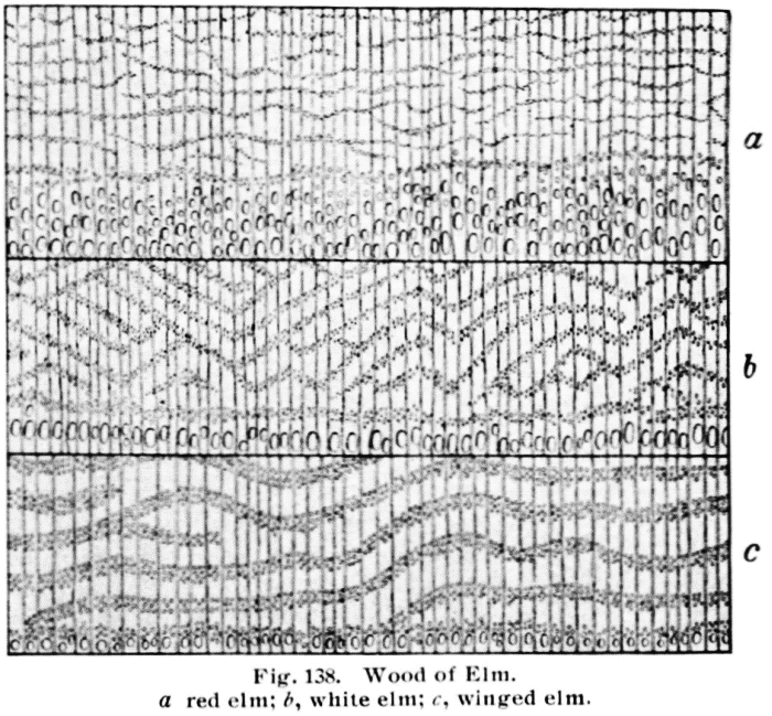 Red maple is not always safely distinguished from soft maple. In box elder the pores are finer and more numerous than in soft maple. The various species of elm may be distinguished as follows: