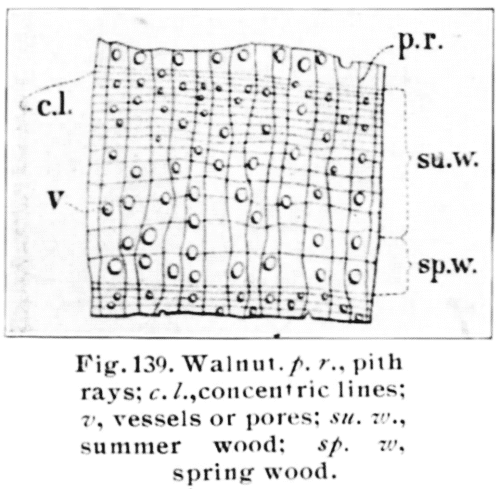 Fig. 139. Walnut. p.r., pith rays; c.l., concentric lines; v, vessels or pores; su. w., summer wood; sp. w., spring wood.