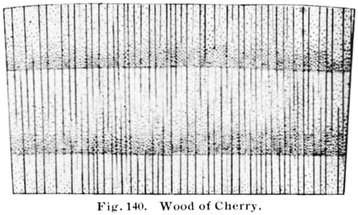 Cherry and birch are sometimes confounded, the high pith rays on the cherry on radial sections readily distinguishes it; distinct pores on birch and spring wood zone in cherry as well as the darker vinous-brown color of the latter will prove helpful.