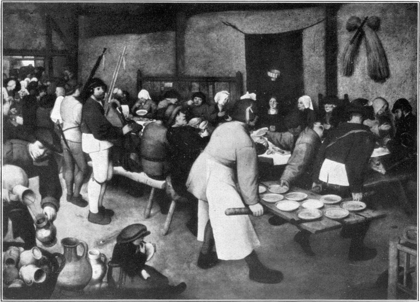 Op eene bruiloft werden vertooningen gedaan en even natuurlijk, dat er gedanst werd, die bevallige, die statige dansen, die thans vergeten zijn. Ook tegen dit dansen heeft de kerk zich altijd verzet, wederom zonder eenig onderscheid te maken tusschen het wezenlijk wulpsche en gemeene èn het sierlijke, losse, gracelijke van den onergerlijken dans. Eens is gansch Groningen in rep en roer geweest, omdat een ouderling op de bruiloft zijner dochter, het was in 1772, het gewaagd had met zijne dame en het jonge paar een menuet te dansen. Betje Wolff heeft het schrikkelijke geval vereeuwigd in haar gedicht: „De menuet en de domineespruik”. Bij boerebruiloften was het dansen zeker niet altijd los en bevallig: wie den „Boerenbruiloftsdans” van Pieter Brueghel (den vader, gest. 1569) ziet, kan daaromtrent geene groote verwachtingen koesteren.