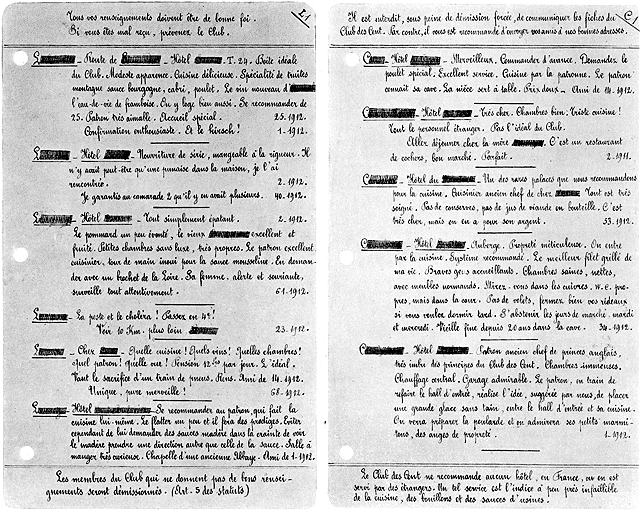 Consignés sur des feuillets mobiles dont l'assemblage forme le plus secret des répertoires de poche, ces précieux renseignements sont transmis aux autres membres, pour leur usage exclusif. Mais il ne leur est pas interdit, tout au contraire, de faire connaître, autour d'eux, les bonnes adresses. «Nul ne mangera bien, hors nous et nos amis», pourraient-ils dire. Et c'est ainsi que, pour le plaisir des vrais gastronomes, ils constituent patiemment, petit à petit, une sorte de dictionnaire de la bonne chère, à la façon dont l'Académie élabore, par un choix judicieux des mots, le dictionnaire du bon langage.