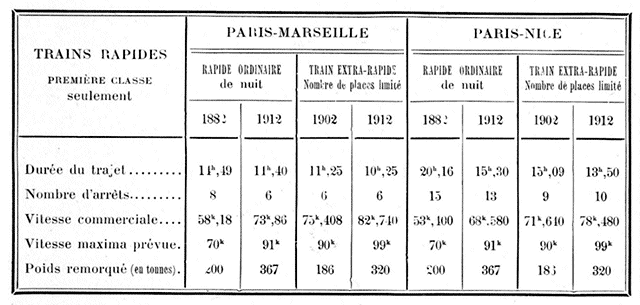 Le premier des deux tableaux suivants montre les progrès réalisés depuis trente ans dans le trajet Paris-Nice et Paris-Marseille par les trains rapides n'admettant que les voyageurs de première classe.