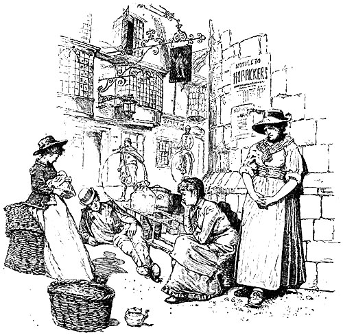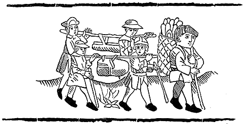 A little further on we passed a hop-field, where the picking had already begun. In one part the poles were stripped of their vines, so that it looked as if the farmer had reaped for [Pg 61]his sowing a crop of dead sticks. In the other the poles were still green, but the day’s work was just over. Women were packing up kettles and pans, jugs and bottles, and stowing babies and bundles into perambulators, while two or three men were going the rounds with bag and basket, measuring the day’s picking, and marking off the account of each picker by notching short, flat pieces of wood held up for the purpose. In the road beyond a large cart, packed with well-filled bags, was being drawn homewards by three horses, while a young man rode up and down the green aisles. ‘I beg your pardon, Sir,’ a farm hand said to J., who had been sketching, ‘but you’ve been takin’ some of our people, and now you hought to take our Guvnor on his ’oss;’ and he pointed to the young man. All the way into the town we passed groups of pickers: women with large families of children, small boys with jugs and coats hung over their shoulders, and young girls with garlands of hops twisted about their hats, and all were as merry as if they had been on a picnic. We saw them still before us, even after we had turned into Saint Dunstan’s Street, from which the gold of the afterglow was fast fading, and were riding between the quaint, gabled houses, through whose[Pg 62] diamond-paned windows lights were beginning to appear. Before us was the old, grey-towered city gate, through which royal and ecclesiastical processions and knights and nobles once passed, but where we now saw only the tramps who had arrived at the eleventh hour sitting at its foot with their bags and baggage.