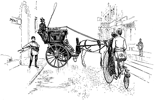 ‘I don’t like tandems, do you?’ he continued, fiercely, as if he were daring us to differ from him. He seemed to think we had come there that he might tell us his grievances; which he did, with much elaboration, while we ate our lunch. He and his wife had been down to Margate from London, and were now on their way back, he said. They had made the trip on a tandem; it was the first time he had ridden one, and it would be the last, for he didn’t like tandems—they were horrid things! Did we like tandems? To avoid repetition, I may here mention that this expression of dislike, together with the query as to our opinion, was the refrain to everything he said. It was always given with the same interest and emphasis as if it were an entirely original remark. The only variation he made was by sometimes beginning with the statement, and at others with the question. He explained the reasons for his dislike. The principal was, that the people one met on the roads always insulted riders on a tandem. Why, he had been off his machine a dozen times that morning, fighting men who had been chaffing him! I thought, with a shudder, of the crowd of hucksters[Pg 50] J. would have had to fight by London Bridge, had he been of the same mind. Then, the next objection was, that he had to sit behind his wife—she had to steer, and he would not be surprised if he were seriously injured, or even killed, before he got back to London. Women were heedless things, and easily frightened. His wife, who had joined us a few minutes before, here grew angry, and a slight skirmish of words followed between them: she reminded him of the dangers they had escaped through her nerve and skill; he recalled the dangers into which they had run owing to her thoughtlessness and timidity. But, just at this point of the discussion J. took out his watch. At sight of it the little man forgot his anger to pounce upon it, with never as much as ‘An it please you!’ Then, looking up in triumph, he exclaimed, ‘I knew it! it’s an American watch! They know how to make watches over there, but they’re ruining our trade.’ Then he explained that he was a London watchmaker, and he pulled out of his pocket a large substantial specimen of his workmanship.
