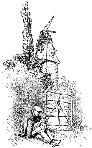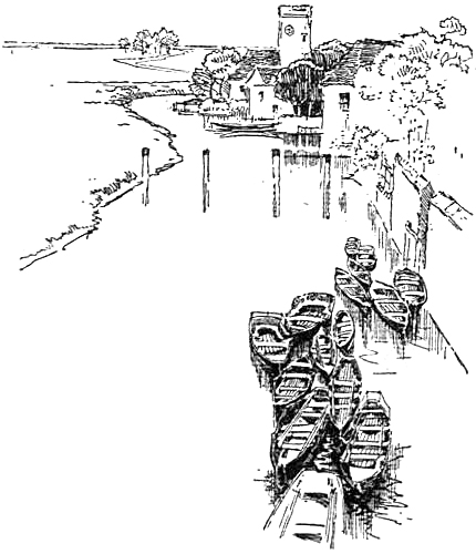 It seemed at first a sleepy little village. The only signs of life were on the bridge. Here about a dozen men were smoking their morning pipes, and as many boys were leaning over the wall, lazily staring into the river below, or at the cool stretches of woodland and shady orchards on the hillside beyond. But presently, as we waited, the village clock struck nine, and at once the loud bell in the factory on the other side of the little river Cray began to ring. One by one the older loungers knocked the ashes from their pipes and passed through the gate. The boys lingered. But their evil genius, in the shape of an old man in a tall white cap, came out, and at his bidding they left the sunshine and the river and hurried to work. A man with a cart full of shining onions went by, and we followed him up a hilly street, where the gabled and timbered cottages seemed to be trying to climb one over the other to reach a terrace of shining white houses at the top. The first of these was but one-storied, and its tall chimney-pot threw a soft blue shadow on the higher wall of the house next to it. On a short strip of ground which stretched along the[Pg 19] terrace patches of cabbages alternated with luxuriant crops of weeds. In one place there were stalks of pink hollyhock and poles covered with vines, and in the windows above were scarlet geraniums. About them all there was a feeling of warmth and light, more like Italy than England. J. took out his sketch-book. Several women, startled by the novelty of strangers passing by, had come out and were standing in their small gardens. When they saw the sketch-book they posed as if for a photographer—all except one old woman, who hobbled down the street, talking glibly. Perhaps it was as well we did not hear what she said, for I think she was cursing[Pg 20] us. When she was close at our side and turned, waving her hands to the other women, she looked like a great bird of ill-omen. ‘Go in! go in!’ she croaked: ‘he’s takin’ of yere likenesses. That’s wot he’s arter!’ Her wrath still fell upon us as we wheeled out of Crayford.