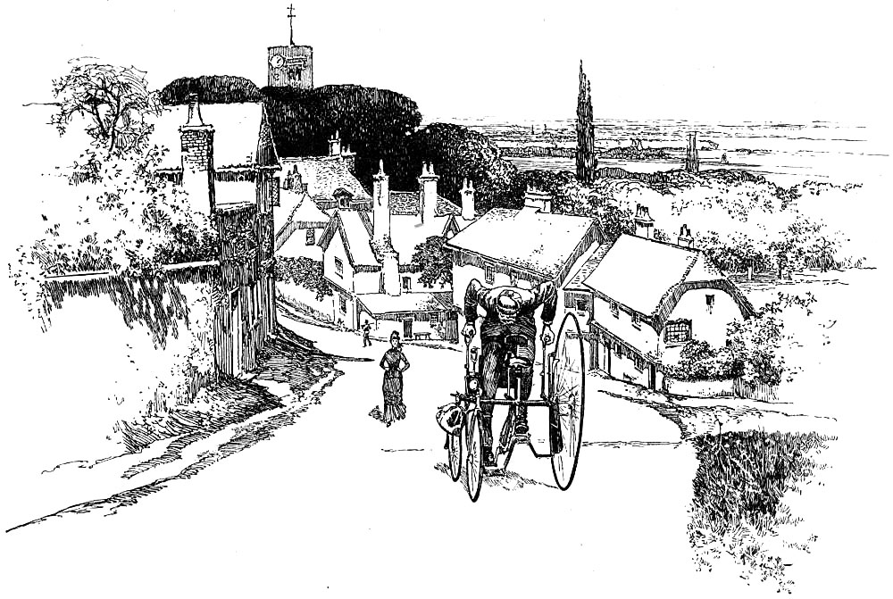 Dartford, from a cycler’s point of view, is a long narrow street between two hills, one of which is good to coast, the other hard to climb. The place, as we saw it, was full of hucksters and waggons, and footmen and carriages, and we passed on without stopping, save by the river that runs near a church, with a tower and an unconventional clock looking out from one side instead of from the centre, which is the proper place for clocks.