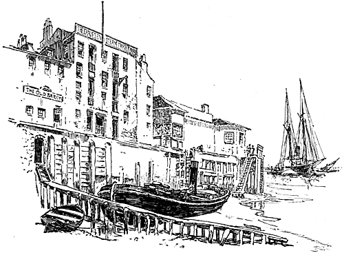 Gravesend is not a very striking place as you enter it from the road. It was to us remarkable chiefly for the Rosherville Gardens, which hitherto we had known only in our Dickens. But we found a pleasant ‘ale-stake’ by the river, where we rested to ‘both drinke and biten on a cake;’ or, rather, on substantial beefsteak and vegetables. There was no one else in the coffee-room, but one or two dogs strayed in from the private bar, and seeing we were at dinner became very sociable. The maid who waited on us was friendly too, and while J. was busy putting away the tricycle she was even moved to confide in me. She was the only maid in the house, she said. There had been another, but she had gone some time ago; ‘and there’s a jolly hard lot of work for one woman to do, ma’am,’ she went on. ‘I’m not used to it, and I can’t stand it much longer. I’ve always been in a private before. It’s easy enough to go from a private to a public, but to get from a public to a private again is another thing. Onst in a public is always in a public, ma’am!’ Then some one called her. I was glad to have her go, for her way of telling her trouble had in it something of the Greek doctrine of fate, and so long as her eye was upon me I had[Pg 29] an uncomfortable feeling, as if I were one of the instruments decreed from all time to work out her cheerless destiny. It was more agreeable to look out of the window on the little lawn in front, where two comfortable matrons were drinking beer, and a Blue-coat boy, home for the holidays, was running around, showing his orange legs to the best advantage. It was quiet on the river. Large steamers, small steam-tugs and row-boats, were lying at anchor. An old coastguard hulk was moored opposite, and an officer walked solemnly up and down the deck, every now and then halting to look[Pg 30] through a spyglass for suspicious craft. But as we stood on the pier, after we had dined, the tide turned, and swiftly and silently all the boats turned with it. Tugs gave shrill whistles in warning of their speedy departure. Sail-boats unfurled their sails. Sailors came down the watersteps, leading from the houses built on high walls at the water’s edge, and rowed quickly to the coastguard boat, saluted the solitary officer, and disappeared below. In the large P. and O. steamer, anchored at some distance from the pier, we could see the red turbans and white tunics of Lascars moving to and fro on the decks. The river was now as lively as it had before been quiet. But it monopolised the activity of the place, for when we went back for our tricycle we met only one or two seamen and a handful of children.