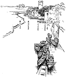 From Dartford to Gravesend the road became more pleasant every minute. Here and there were brown fields, where men were ploughing, or perhaps burning heaps of stubble, and sending pale grey clouds of smoke heavenwards; here and there were golden meadows where gleaners were busy, and then, perhaps, a row of tall, dark poplars, or a patch of brilliant cabbages. To the south, broad plains, where lazy, ease-loving cattle were grazing, stretched as far as the eye could see. To the north, every now and then, as the[Pg 27] road turned, we saw the river, where ships were at anchor, and steamers were steaming up to London, and black barges, with dark-red sails, were floating down with the tide. The water was blue as the sky, and the hills in the distance seemed to melt into a soft purple mist hanging over them. By the road and by the river were many deep deserted quarries, whose white chalk cliffs could be seen from afar, while they brought out in strong contrast the red roofs of the cottages built at their feet. We came to one or two small villages and another church, with its tower and a clock awry, so that we wondered whether this was a fashion in Kent. And all along the hedges were white and pink with open [Pg 28]morning-glories, and the trees threw soft shadows over the white road, and everywhere the air was sweet with the scent of clematis.