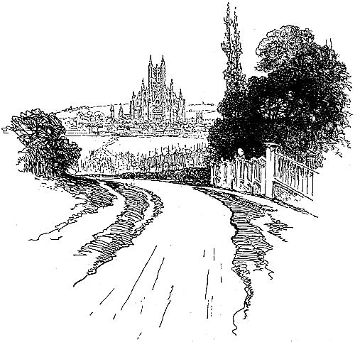 There is no record that mine host and the Chanones Yeman dismounted and walked to rest their horses. But all the many waggons and carriages and cycles we saw above us on the modern road were being led, not driven. Halfway up was an old lumbering stage, with boxes piled on the top, and big baskets and bundles swinging underneath. The driver was walking; but a tramp, who had made believe to push when on level ground, now sat comfortably on the backseat, taking his ease. A little lower was the friendly driver with his empty carriage, for he had rested at the ‘Squirrel,’ and so we had caught up to him again. At the top we looked back to see that the West was a broad sea of shining light. A yellow mist hung over the plain, softening and blending its many colours. Far off to the north the river glittered and sparkled, and a warm glow spread over the green of the near hillsides. The way in front of us was grey and colourless by comparison. It was almost all down-hill after this. Did I want to be driven into Canterbury, indeed? My benevolent[Pg 57] friend might now have asked us to pull him in. The stage made a show of racing us, but we gave it only a minute’s chance. An officer in braided coat driving a drag passed us triumphantly while we were on our up-grade; but when we came again to a level we left him far behind.