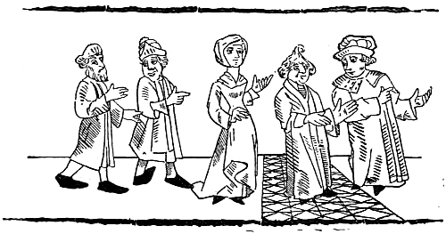 Telling his felowe of sportys and of chere,
