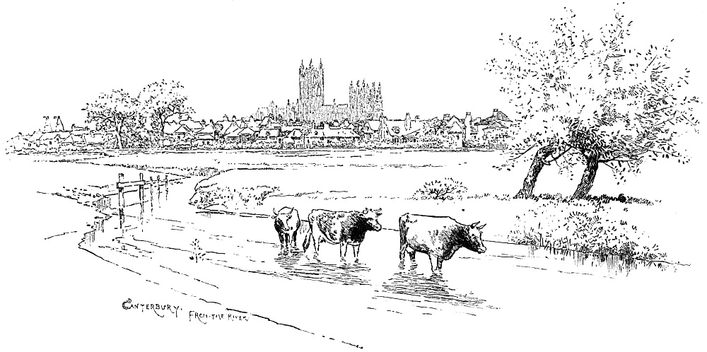 We rose early the next day, and, that we might be in all possible things like the men in whose steps we were walking, we ‘cast on fresher gowns’ before we started to walk through the town. Then, after we had breakfasted, we set out with our new friend for the Cathedral. Our way led through the gate, on which the sun shone brightly, and where tramps were still waiting to be hired; and then through the High Street, filled with other pilgrims, who spake divers tongues, who wore not sandal, but canvas shoon, and who had their ‘signys’ in their hands and upon their ‘capps,’ for many had puggarees about their hats, and still more carried red guide-books. The air was warm, but fresh and pure as if the sea-breeze had touched it; and the gables and carvings of the old houses were glowing with sunlight. The reflection of the red roofs and of geraniums and hollyhocks in gardens by the way made bright bits of colour in among the tall reeds of the little river Stour, and[Pg 70] as we went slowly along we talked, as befitted the occasion, of bygone times, for at every step we were reminded of those earlier travellers whose humble followers we were. Here we came to the Hospital of St. Thomas, now an almshouse, of old the place where poor pilgrims found shelter; and here, in the ground-floor of a haberdasher’s shop, we saw a [Pg 71]few arches of what was once the ‘Chequers of the Hope,’ where the rich were lodged; and so, when in Mercery Lane, where the houses almost met above in a friendly, confidential way, we saw a man in cocked-hat and knee-breeches and much gold lace, it seemed as if he, like everything else in Canterbury, must be a relic of the olden time.