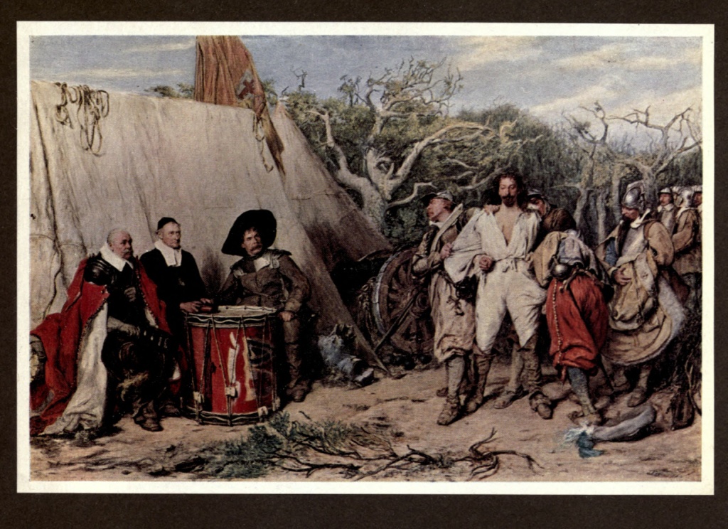 To the two years spent in Fitzroy Square, and to the ten years following, belong several of Pettie's finest works. His keen perception of dramatic incident, his fine sense of colour, and his brilliance of craftsmanship, soon drew the attention they deserved. In 1865 his "Drum-head Court-Martial" was one of the pictures before which visitors clustered daily when it hung on the Academy walls. It is a dashing picture, full of spirit in idea and design; and the artist seldom painted anything better, or more full of character, than the heads of those commanders sitting in judgment.