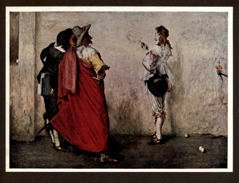 In 1874 Pettie was elected a Royal Academician, filling the vacancy caused by the death of Sir Edwin Landseer. His first exhibits were two of his finest works, "A State Secret," and "Ho! Ho! Old Noll!" The scene in the latter is a tennis-court where two cavaliers are looking on with a chuckle of amusement at the spirited caricature which a third has made upon the wall. "Ho! Ho! Old Noll" is the work of a master draughtsman. The light pose and easy grace of the cavalier who makes the sketch, the foreshortening of his arm, the hand that holds the chalk—so lightly that it seems to move—are all superbly rendered. Two years later, in 1876, he exhibited "The Step," a picture of a little girl with golden hair, in a pale blue dress, dancing before her grandmother. The same old lady, with spinning-wheel and high-backed chair, formed the subject of a picture titled "Grandmother's Memories."
