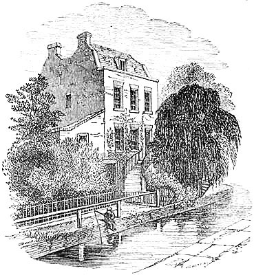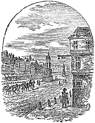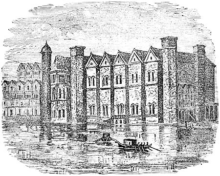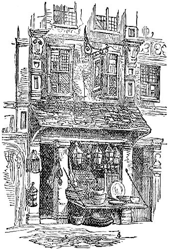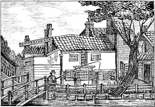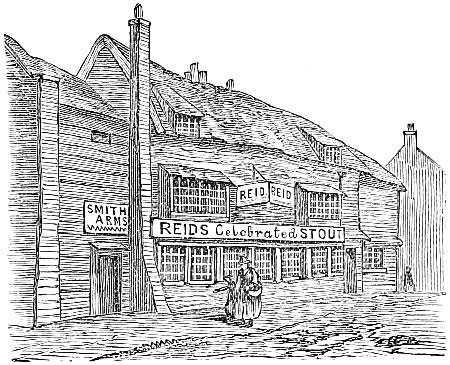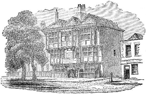 “Not long since, after a pleasing and interesting walk, one fine morning on Bankside, and standing near the still existing Cardinal Cap Alley, with the aid of an artist friend, we drew up a fancy picture of what Bankside was in Shakespeare’s day.—Here a small creek with craft and busy life around; a small bridge, with road leading to the Globe, the famous theatre afterwards to be so widely known. The sunshiny time of our literature and life, making a red-letter period in happy old England’s history. We were interrupted by a kindly-faced, round-shouldered man of the bargee type, who asked us ‘if it was Shakespeare, him as writ plays, we was a torkin’ on; if so be it were, he could show us the wery ’ouse he used, least ways, all as is left on it.’ After a twisting tramp through Cardinal Cap Alley, we were brought out opposite the public-house known by the name of the ‘Smith Arms,’ which had just then only escaped entire demolition from fire by a very near chance—(the damage done has since necessitated the rebuilding; so the sketch stands as a bit of rescued old London.)