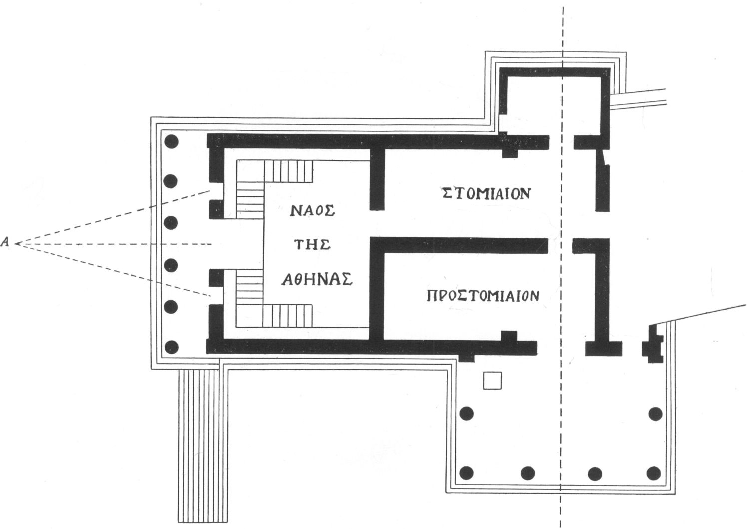 Neither Pericles nor Mnesicles gave consent to the erection of the Temple of Wingless Victory. In the leaning anta which was built to stand free one reads their buried hope that the Propylaea might enjoy a finely impressive command of the whole region west of the acropolis, a command unannoyed by the hostile lines of the structurally insignificant temple of Victory.
