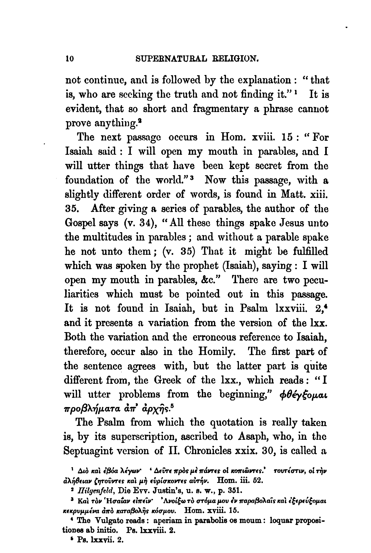 The next passage occurs in Hom. xviii. 15: "For Isaiah said: I will open my mouth in parables, and I will utter things that have been kept secret from the foundation of the world."(3) Now this passage, with a slightly different order of words, is found in Matt. xiii. 35. After giving a series of parables, the author of the Gospel says (v. 34), "All these things spake Jesus unto the multitudes in parables; and without a parable spake he not unto them; (v. 35) That it might be fulfilled which was spoken by the prophet (Isaiah), saying: I will open my mouth in parables, &c." There are two peculiarities which must be pointed out in this passage. It is not found in Isaiah, but in Psalm lxxviii. 2,(4) and it presents a variation from the version of the lxx. Both the variation and the erroneous reference to Isaiah, therefore, occur also in the Homily. The first part of the sentence agrees with, but the latter part is quite different from, the Greek of the lxx., which reads: "I will utter problems from the beginning," [———].(5)