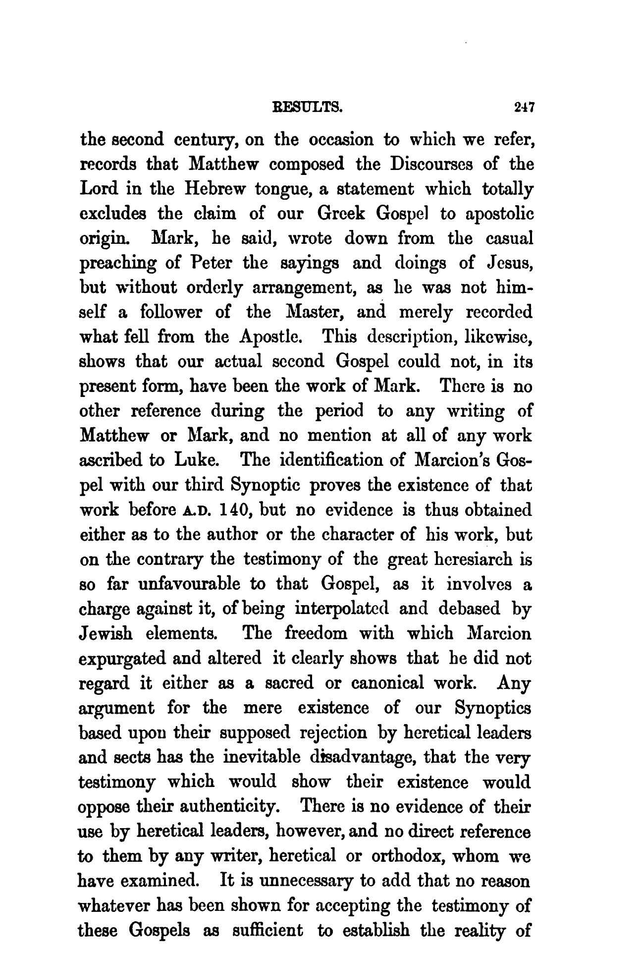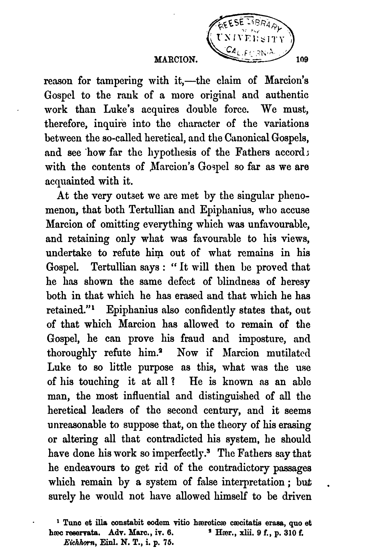 We may here refer to the passage, the only one pointed out by him in connection with the Synoptics, the discovery of which Canon Westcott affirms, "has removed the doubts which had long been raised about those (allusions) to St. Mark."(1) The discovery referred to is that of the Codex Ottobonianus by Dressel, which contains the concluding part of the Homilies, and which was first published by him in 1853. Canon Westcott says: "Though St Mark has few peculiar phrases, one of these is repeated verbally in the concluding part of the 19th Homily."(2) The passage is as follows: Hom. xix. 20: "Wherefore also he explained to his disciples privately the mysteries of the kingdom of the heavens." This is compared with Mark iv. 34.... "and privately to his own disciples, he explained all things."