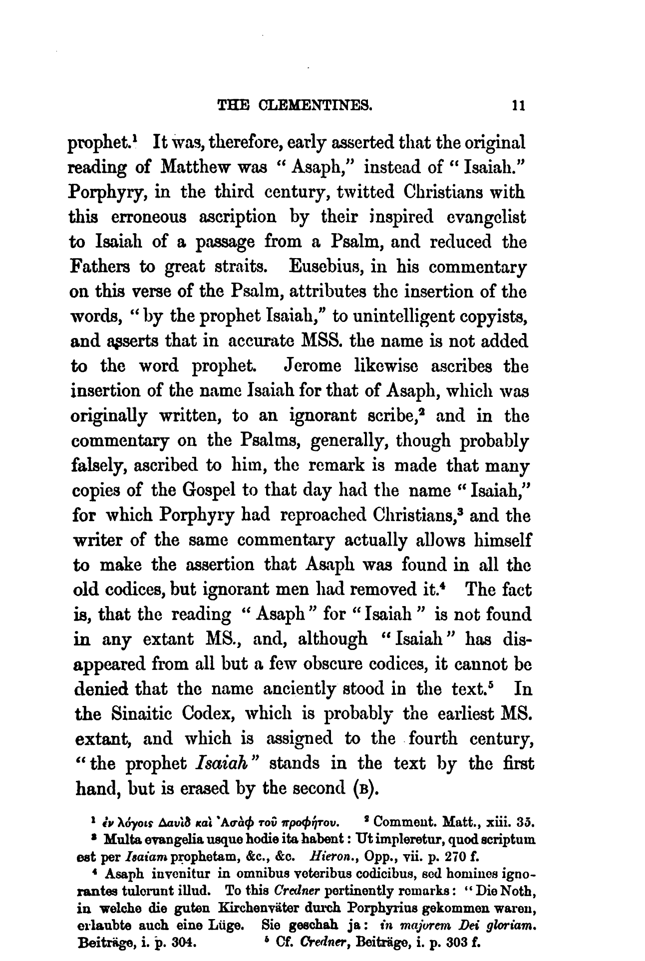 prophet.(1) It was, therefore, early asserted that the original reading of Matthew was "Asaph," instead of "Isaiah." Porphyry, in the third century, twitted Christians with this erroneous ascription by their inspired evangelist to Isaiah of a passage from a Psalm, and reduced the Fathers to great straits. Eusebius, in his commentary on this verse of the Psalm, attributes the insertion of the words, "by the prophet Isaiah," to unintelligent copyists, and asserts that in accurate MSS. the name is not added to the word prophet. Jerome likewise ascribes the insertion of the name Isaiah for that of Asaph, which was originally written, to an ignorant scribe,(2) and in the commentary on the Psalms, generally, though probably falsely, ascribed to him, the remark is made that many copies of the Gospel to that day had the name "Isaiah," for which Porphyry had reproached Christians,(3) and the writer of the same commentary actually allows himself to make the assertion that Asaph was found in all the old codices, but ignorant men had removed it.(4) The fact is, that the reading "Asaph" for "Isaiah" is not found in any extant MS., and, although "Isaiah" has disappeared from all but a few obscure codices, it cannot be denied that the name anciently stood in the text.(5) In the Sinaitic Codex, which is probably the earliest MS. extant, and which is assigned to the fourth century, "the prophet Isaiah" stands in the text by the first hand, but is erased by the second (b).