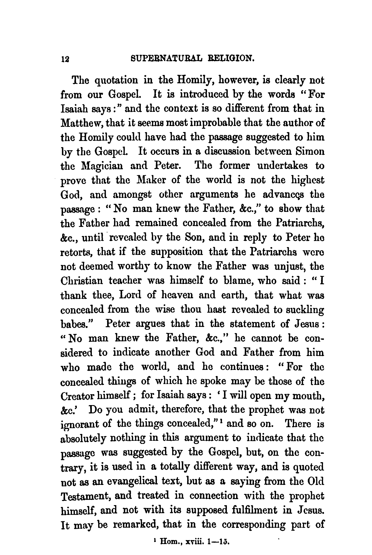 The quotation in the Homily, however, is clearly not from our Gospel. It is introduced by the words "For Isaiah says:" and the context is so different from that in Matthew, that it seems most improbable that the author of the Homily could have had the passage suggested to him by the Gospel. It occurs in a discussion between Simon the Magician and Peter. The former undertakes to prove that the Maker of the world is not the highest God, and amongst other arguments he advances the passage: "No man knew the Father, &c.," to show that the Father had remained concealed from the Patriarchs, &c., until revealed by the Son, and in reply to Peter he retorts, that if the supposition that the Patriarchs were not deemed worthy to know the Father was unjust, the Christian teacher was himself to blame, who said: "I thank thee, Lord of heaven and earth, that what was concealed from the wise thou hast revealed to suckling babes." Peter argues that in the statement of Jesus: "No man knew the Father, &c.," he cannot be considered to indicate another God and Father from him who made the world, and he continues: "For the concealed things of which he spoke may be those of the Creator himself; for Isaiah says: 'I will open my mouth, &c.' Do you admit, therefore, that the prophet was not ignorant of the things concealed,"(1) and so on. There is absolutely nothing in this argument to indicate that the passage was suggested by the Gospel, but, on the contrary, it is used in a totally different way, and is quoted not as an evangelical text, but as a saying from the Old Testament, and treated in connection with the prophet himself, and not with its supposed fulfilment in Jesus. It may be remarked, that in the corresponding part of